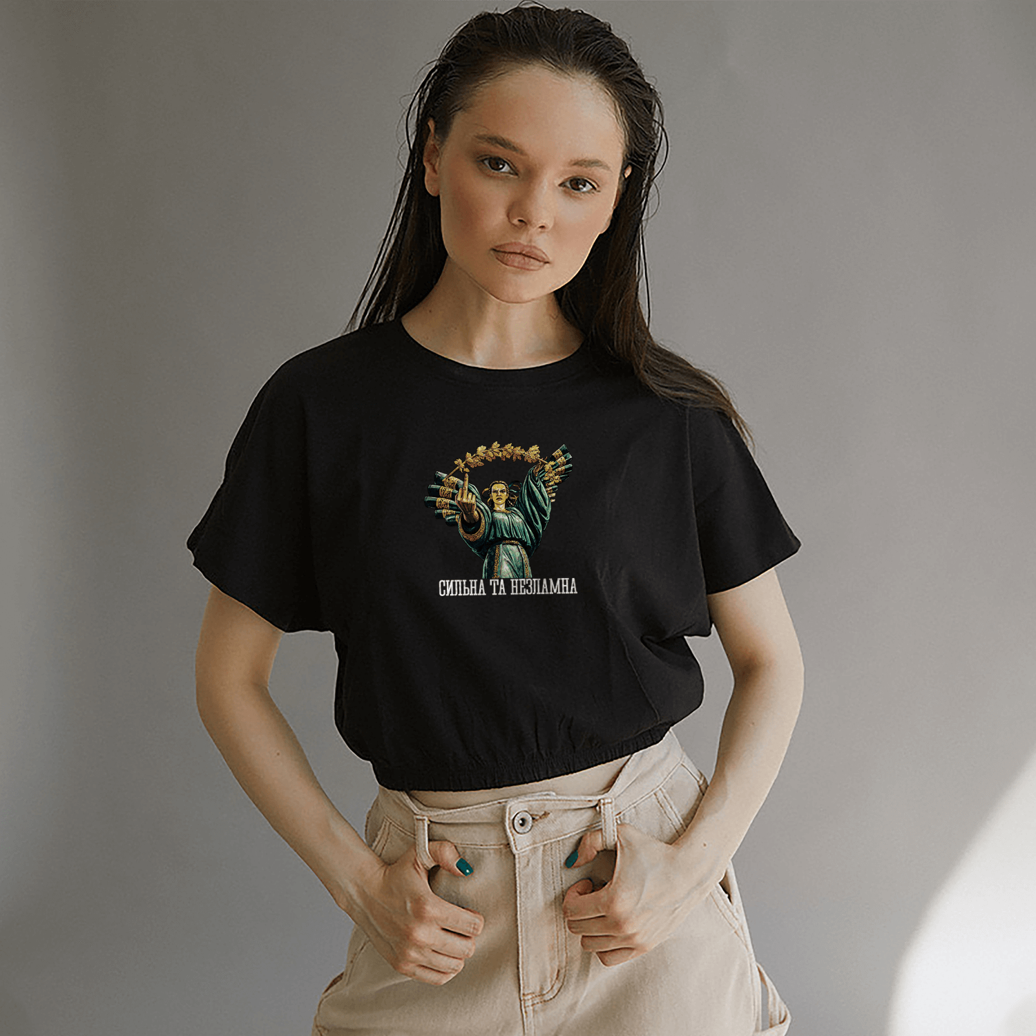 Футболка з авторським принтом, що символізує внутрішню силу, стійкість і жіночу незламність. Лаконічний дизайн із глибоким змістом підкреслює характер і позицію без зайвих слів.